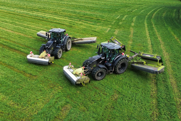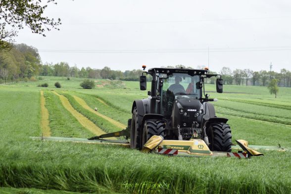 Wir mähen mit zwei Krone Front-Heck Mähwerkskombination mit 9,20 Meter Arbeitsbreite.