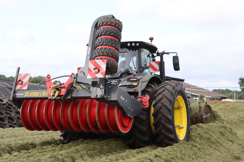 Ein 13 Tonnen schwerer Walzschlepper mit Siloverteiler und Zwillingsbereifung sorgt für die optimale Verdichtung Ihrer Silage.
